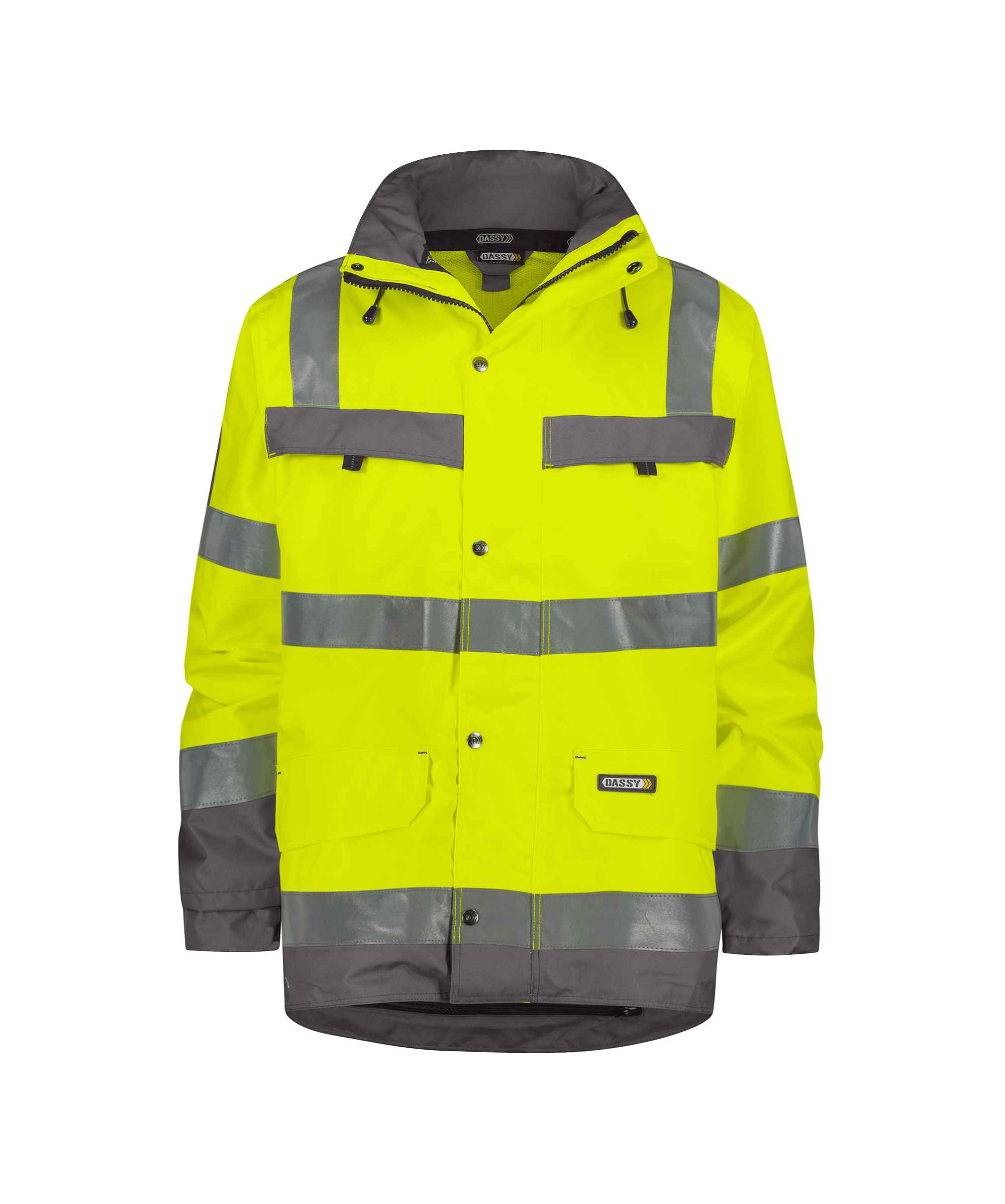 Opvallend droog, dankzij de DASSY® Safety HiVis Atlantis hogezichtbaarheidsparka. Deze waterdichte, winddichte en ademende parka biedt een hoogwaardige bescherming tegen regen en slecht weer. Graag wat meer warmte ? Gebruik de praktische systeemritssluiting en rits de gewatteerde bodywarmer DASSY® Bilbao in je vest!