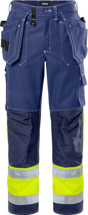 FAS® Fristads beste keperkatoen / 2 weg te steken met CORDURA® verstevigde loshangende spijkerzakken, de linker met extra zak en de rechter zak met 3 kleine zakjes en gereedschapslussen / 2 steekzakken en harmonika-achterzakken / 2 D-ringen aan de tailleband / Beenzak met klep en drukknoopsluiting, telefoonzakje met klep en klittenbandsluiting, verborgen ID-pashouder / 2 hamerlussen / Duimstokzak van CORDURA® over de zijnaad geplaatst met gereedschapszak en pennenzakje en 2 knopen en lussen voor 2 werkmessen / Voorgevormde knieën / Met CORDURA® verstevigde kniezakken met opening voor in hoogte verstelbare kniebescherming / Goedgekeurd volgens EN 14404 samen met kniebeschermers 124292 en EN ISO 20471 klasse 1 / OEKO-TEX® gecertificeerd.