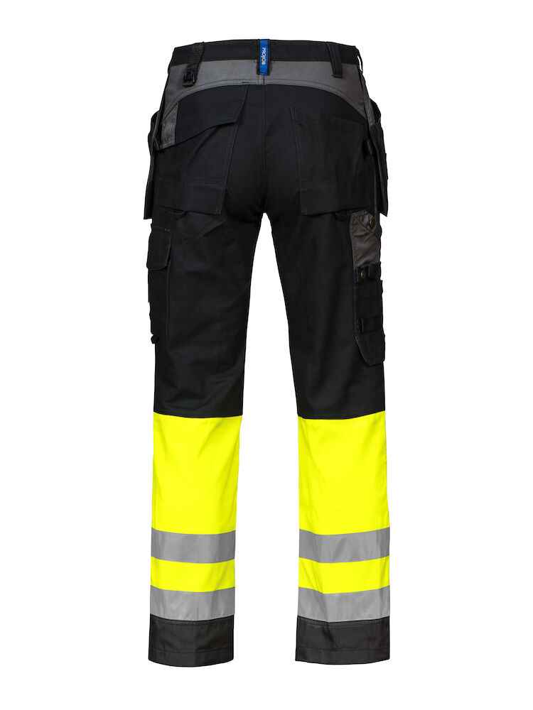 Beschikbaar in diverse maten van C44 tot C62 en in opvallende kleuren zoals geel/marine, geel/zwart en oranje/zwart. Deze werkbroek is perfect voor een hoge zichtbaarheid (klasse 1) en biedt geen rits, maar wel een stevige constructie van 100% katoen met verstevigingen van polyamide Cordura®.